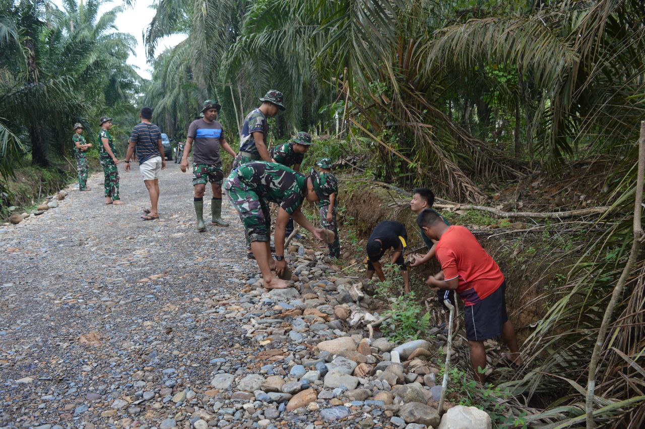 Palas – Satuan Tugas TNI Manunggal Membangun Desa (Satgas TMMD) ke-123 Kodim 0212/Tapsel menggelar kegiatan pembersihan parit Kiri kanan jalan yang baru di buat di Desa Pintu Padang Kec. Ulu Barumun Kab. Palas, Senin (24/02/2025)