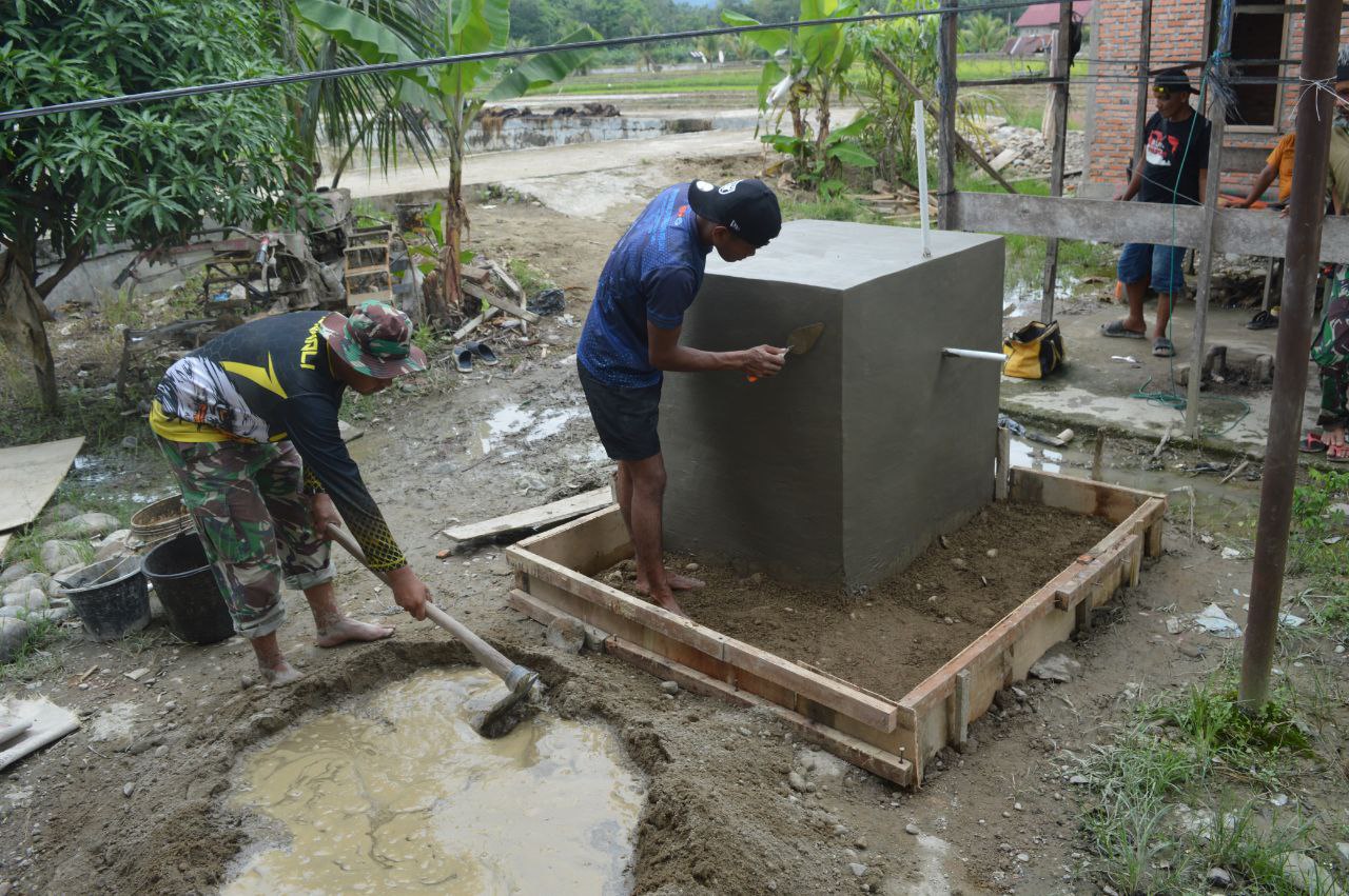 Salah satu sasaran program yang tengah di kebut adalah pembangunan sumur bor, di mana para personel bersama warga setempat melaksanakan pengecoran lantai untuk memastikan progres berjalan sesuai target