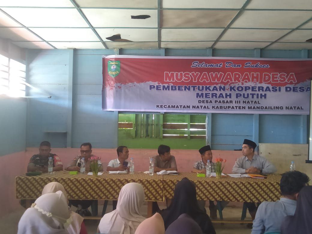 Natal– Babinsa Koramil 17/Natal Kodim 0212/Tapsel Kopda Tri Widodo menghadiri kegiatan Musyawarah Desa Khusus (MUSDESUS) dalam rangka pembentukan Koperasi Desa “Merah Putih” yang dilaksanakan di Kantor Desa Pasar III Natal Kecamatan Natal Kabupaten Mandailing Natal, Kamis (22/05/2025)