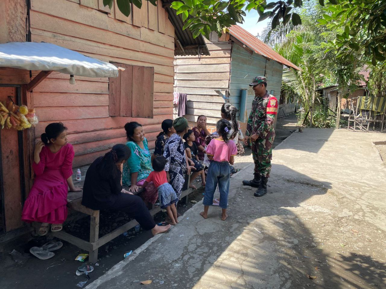 Dalam kegiatannya, Babinsa menyinggahi salah satu rumah warga sekaligus melaksakan komsos menjalin dan membina silaturahmi serta pendekatan bersama ibu-ibu dan anak-anak di wilayah desa binaan
