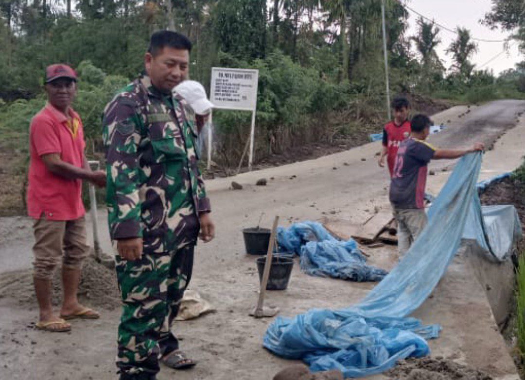 Sipirok – Babinsa Koramil 03/Sipirok Kodim 0212/Tapsel Serka Nyono Purnomo bantu warga dalam kegiatan perbaikan jalan usaha tani di Desa Sampean Kecamatan Sipirok Kabupaten Tapanuli Selatan, Jumat (05/09/2025)