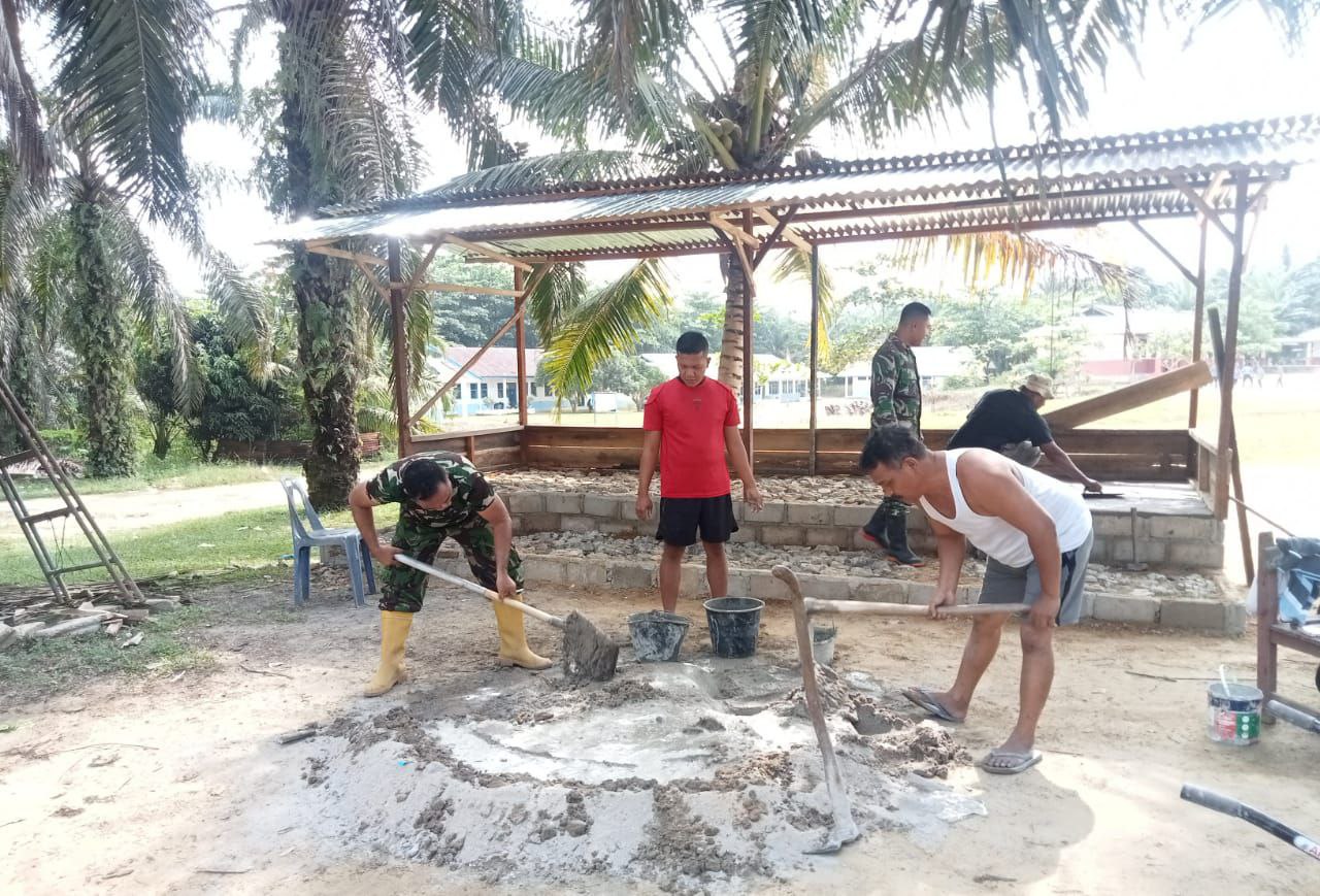 Padang Bolak – Babinsa Koramil 05/PB Kodim 0212/Tapsel Serda Andi Sukisno bantu warga membangun pondok jualan sederhana di Kelurahan Pasar Gunung Tua Kecamatan Padang Bolak Kabupaten Padang Lawas Utara, Rabu (10/09/2025)