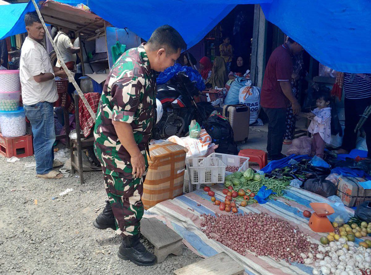 Saipar Dolok Hole – Menjelang hari raya Idul Fitri 1447 H, Babinsa Koramil 04/SDH Kodim 0212/Tapsel Serma Anton Pane melaksanakan monitoring dan pengecekan ketersediaan sembako serta harga sembako secara langsung di kios-kios dan pedagang yang ada di pasar tradisional di Kelurahan Aek Simotung Kecamatan Saipar Dolok Hole Kabupaten Tapanuli Selatan, Selasa (17/03/2026)